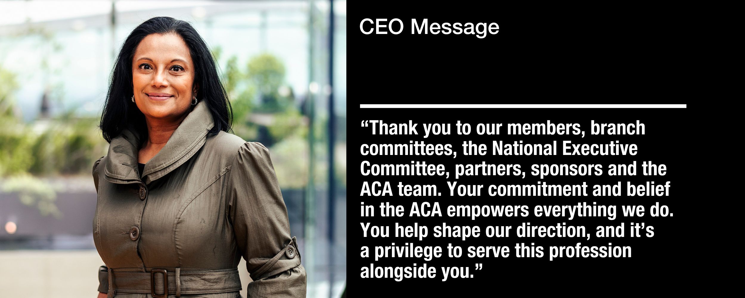 Thank you to our members, branch committees, the National Executive Committee, partners, sponsors and the ACA team. Your commitment and belief in the ACA empowers everything we do. You help shape our direction, and it’s a privilege to serve this profession alongside you.