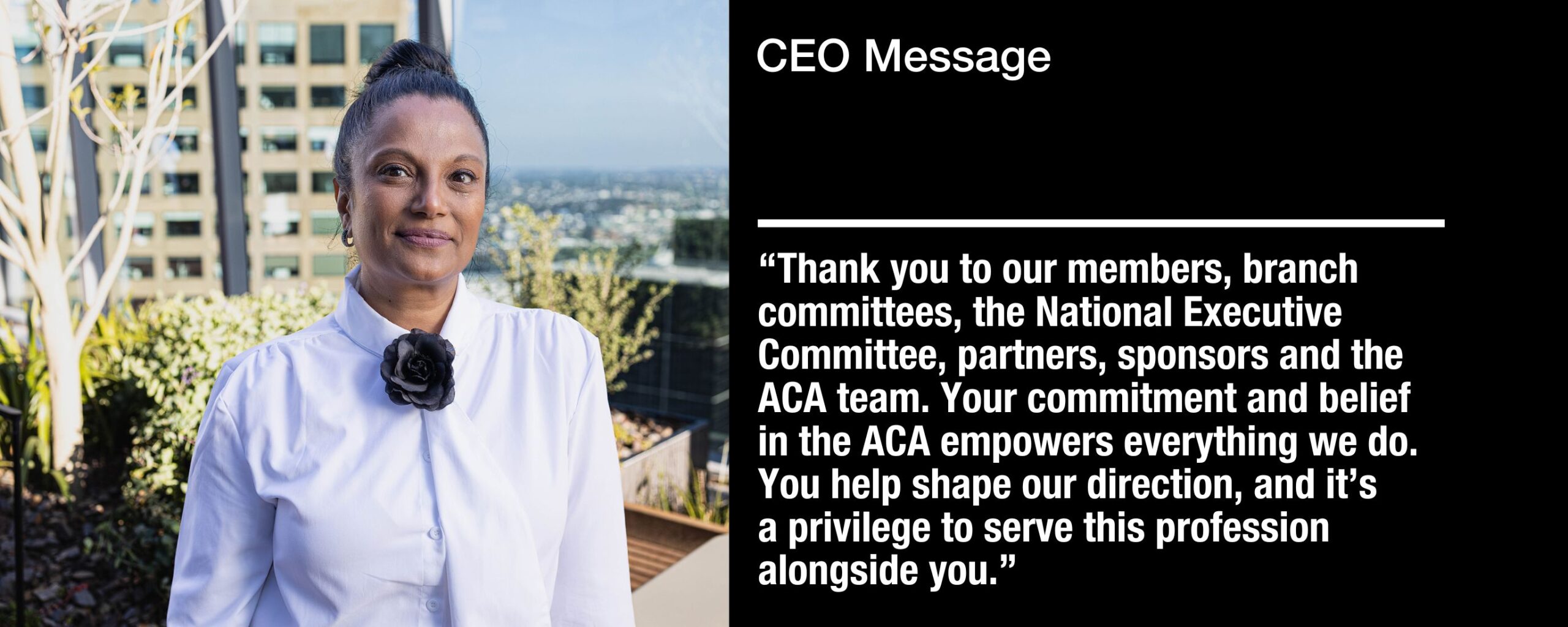 Thank you to our members, branch committees, the National Executive Committee, partners, sponsors and the ACA team. Your commitment and belief in the ACA empowers everything we do. You help shape our direction, and it’s a privilege to serve this profession alongside you.